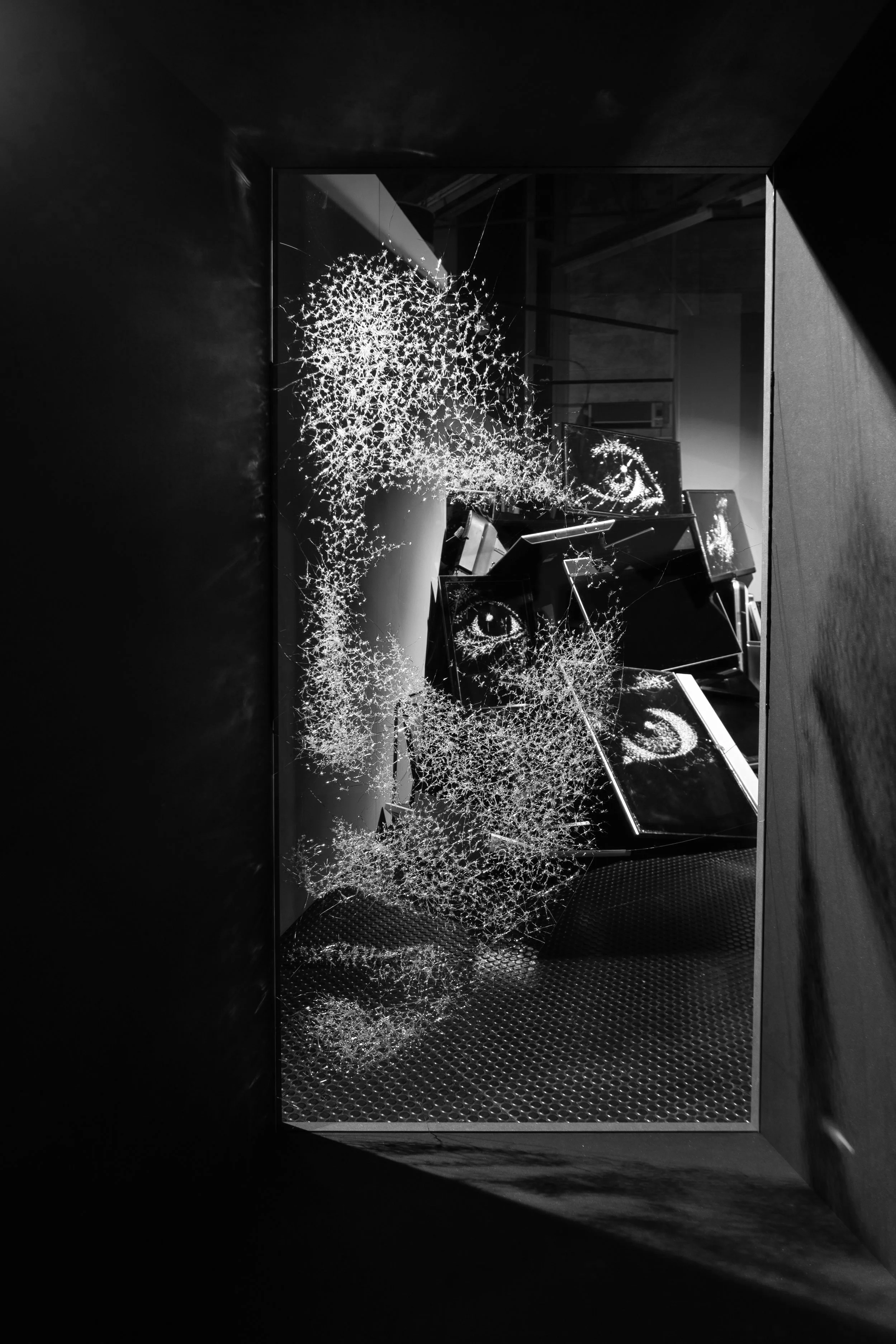 Human faces have always fascinated me“ - Simon Berger asserts. It is this fascination with the face - the canvas of the soul - that lies at the heart of his artistic research which he translates into mesmerising portraits of great allure. Their power thereby resides not only in the expressive force of the sitter‘s eyes but moreover the artist’s material of choice. Glass, one of the hitherto undervalued media for creative endeavours, serves hiwith its rich semantics as a starting point for a portraiture of unprecedented kind. The cracks and creases Simon Berger drives into the surface of his vitreous material resonate with the force of powerful incursion, thereby creating an echo that reverberates through the final image he carves and utlimately liberates from the depth of the glass pane. In its dichotomous nature - liquid and solid, transparent and opaque, fragile and strong - glass acts as an animated support for a new hyperrealistic portraiture. A material that lends itself to a double modality of being looked both at and through, it affords a subtle play with and allusion to the innumerable facets that constitute the human psyche and mind. Deemed one of the greatest - for impenetrable and hence unresolved - mysteries, the human condition is revealed in its fragile strength through the artist who virtuously exploits the transparency of the glass pane by daring a glance ‘beyond painting‘. The human face, the most elaborate of all masks, emerges inadvertently in a form of anti- creation, coming into being through the shattering stroke of Simon Berger‘s bold artistic gesture. By this revolutionary creative act, modes of seeing and perceiving are questioned as the image constantly hovers between disintegration and reconstitution, intrinsically bound to the viewer‘s perspective. The perceptual challenge Simon Berger confronts the beholder with proves integral to his work, a reversal of common habits of looking rooted in a tradition of the ‘static‘ picture. Instead, his are portraits whose dynamic nature speaks to an aesthetic phenomenology in the perception of art that lives by the concrete, physical experience of the glass canvas. “The artwork is present“, the (new) adage goes. A presence whose seductive force intimately ties beholder to beheld as the vitreous surface turns into a mirror for the viewer to project themselves.